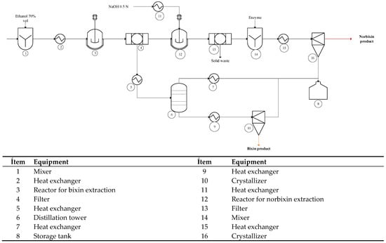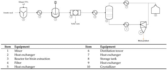 The raw material was dried and milled (depending on the experimental results). The bixin extraction was carried out using ethanol with a feed rate of 25 L per kilogram of seed at a temperature of 70 °C. Then, the bixin-rich extract was separated by filtration, and the remaining solid stream was disposed of as residue. Distillation technologies at 85 °C were implemented to separate bixin from the solvent [34]. Finally, solid bixin was produced with a crystallization stage. A representative process flowsheet is shown in Figure 1.