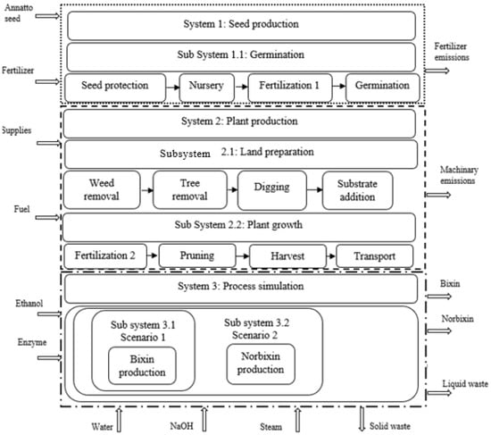 The system boundary defines which process will be included or excluded from the system and is divided into systems and subsystems. The system boundaries are presented in Figure 3. System 1 corresponds to the seed germination, and the subsystem of the germination is considered. System 2 involves the production of annatto plants (seedling production), and the subsystems are: (i) the soil preparation, and (ii) the plant growth for its subsequent harvest. System 3 corresponds to the two process scenarios mentioned above.