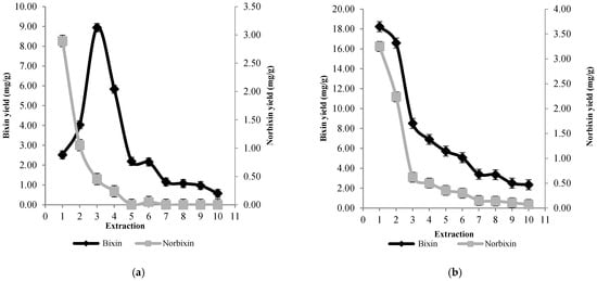 Figure 4 shows the results obtained for the bixin extraction sequences from ground seeds (Figure 4a) and natural seeds (Figure 4b). It is observed that the solvent is not only selective to bixin. Quantities of norbixin are also extracted. Concerning the ground seed, the bixin yield shows an increasing trend when sequential extractions are carried out. The maximum concentration is reached in the third extraction (414.94 mg L−1). This yield increase was expected due to the superficial seed destruction and the consequent easy interaction of the solvent with the solute. After the third extraction, it is observed that the bixin yield decreases due to colorant exhaustion. Furthermore, it is observed that the norbixin yield decreases over sequential extractions due to the amount of this colorant in the first seed layers. The maximum concentration of norbixin was 108.36 mg L−1 in the first extraction. The total yield of bixin and norbixin extraction for the ground seed was 29.45% and 4.69%, respectively.