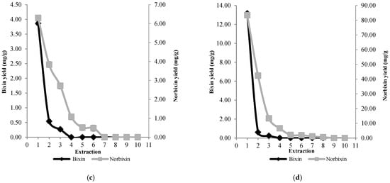 Figure 4 shows the extraction results obtained for the norbixin sequences from ground seeds (Figure 4c) and natural seeds (Figure 4d). As a general result, the norbixin yield decreases when sequential extractions are performed. For the ground seed, the maximum concentration is reached in the first extraction (271.07 mg L−1). A noteworthy difference is observed for the natural seed since a maximum concentration of 4529.32 mg L−1 is reached in the first extraction. This difference is possibly due to the location of norbixin in the seed. Although the seed structure is destroyed (seed–peel separation) in the bixin extraction, the peel remains almost intact, and the norbixin extraction is favored because there is greater interaction with the solvent. Therefore, a decrease in the norbixin yield is also observed in the natural seed.
