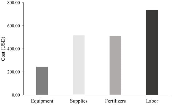 Carbon dioxide (CO2) sequestration with the annatto crop was determined for a three-year plantation, considering the aerial biomass, belowground biomass, and soil organic carbon to determine its environmental contribution to the tropical forests of the region. To establish carbon sequestration, the aerial and belowground biomasses were determined using the indirect method through allometric equations applicable to the biomass of tropical forests in Colombia. Based on the forest characteristics of the biogeographic region of Chocó (tropical rainforest) and an average stem diameter of 10 cm (considering a three-year plantation), the allometric equation listed in Table 2 was used. For aerial biomass, the allometric equation proposed by Alvarez et al. was used [43]. The allometric equation proposed by Cairns et al. [44] was used for belowground biomass. Soil organic carbon was calculated according to the methodology of the IPCC 2006 and from soil survey data supplied by local growers. On the other hand, most studies on carbon storage in tropical forest biomass assume that the biomass of living trees contains approximately 50% carbon [45]; therefore, it is suggested to use the factor of 0.5 to transform biomass into carbon.
