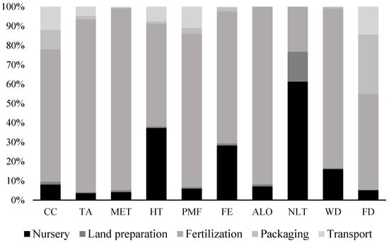 The initial yield of the annatto crop is 625 trees ha−1. The germination ratio of annatto seeds in the nursery stage is 98%. Therefore, excess seeds are required to favor the initial crop yield. The seeds are manually removed from the capsules and are covered with ash in a mass ratio of 1:1, to provide protection and minerals. Generally, the nursery is in the same crop sector; thus, no vehicle is required for seedling transport. The seeds are placed in polyethylene bags with the substrate, then carried in the seedbed (sprouter). The substrate is a mixture of sand and compost in a 2:1 mass ratio, and it must be sterilized with 2 L of hot water (>90 °C). The seed lifespan in the sprouter is around 2.5 months. Over this period, nutrients must be provided to the seedlings for proper growth. Foliar fertilizers are generally used. In this case, the addition of SuperMagro fertilizer, composed mainly of cattle manure and molasses, is applied. Approximately 1 L of fertilizer is dissolved in 19 L of water, and 0.5 L is dispersed in 1 m2. This fertilization should be performed at least every two weeks over the lifespan.
