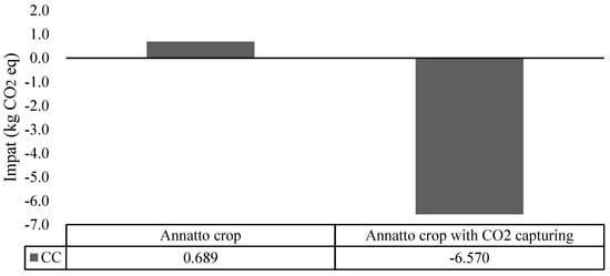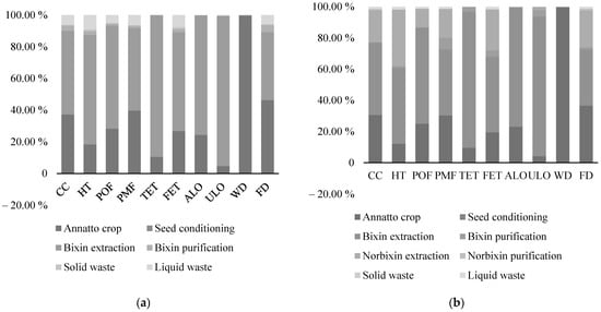 Considering the CC category, 1 kg of bixin production represented 5.57 kg CO2 eq for scenario one and 6.54 kg CO2 eq for scenario two (see Table 9). Scenario two has a higher environmental impact due to the use of additional compounds and energy for the extraction and purification of norbixin. The extraction of bixin using ethanol as a solvent represented 52% in the CC category because, for the analysis, the entire processing part was considered until it was obtained, so there were direct GHG emissions to the atmosphere due to fermentation and transport [74]. In addition, large crop areas were required, which is reflected in the ALO category (representing 75%). On the other hand, chemical contamination caused by alkali substances in the extraction of norbixin, such as NaOH, compromised terrestrial and aquatic ecosystems; in addition, its mismanagement could cause health repercussions [75] (representing 27% in the HT category). In this sense, it is evident that the use of solvents to extract colorant is the main environmental contributor. Similar results have been reported by Kyriakopoulou K et al., where they performed an environmental comparison of different carrot and microalgae carotenoid extraction methods and mentioned that the use of solvents such as hexane and ethanol represented the major environmental contributor, and that methods such as ultrasound-assisted extraction could reduce these impacts [76]. Similar results have been reported in other studies [77]. Moreover, considering the CO2 capture by the crop to evaluate the biorefinery schemes in the context of climate change, scenario one had a contribution of −14.73 kg CO2 eq, and scenario two a contribution of −15.23 kg CO2 eq per kg of bixin.