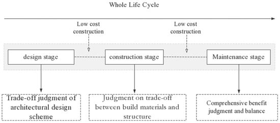 Due to the potential use of green building technology and materials, there are a number of issues that arise during the construction phase that present complex business scheduling and technology application challenges. However, through research, it was discovered that the sustainability achieved through low-cost construction and the sustainability under the green building approach are not mutually exclusive. Rather, their respective foci are different, and the low-cost construction strategy can be shared. When it comes to light pollution, water pollution, and other potential construction issues, as well as cost-management strategies based on green principles, the low-cost construction strategy can be combined with green building construction techniques at various stages [17,18]. A management system for low-cost construction can be set up for the government and developer firms, and alternative engineering management methods can be used depending on the project’s characteristics. Because the return on investment for teams that choose low-cost construction takes some time, the initial cost investment can be supported by specific investments, and the government can also reduce some taxes as a practical measure to assist low-cost renovation.