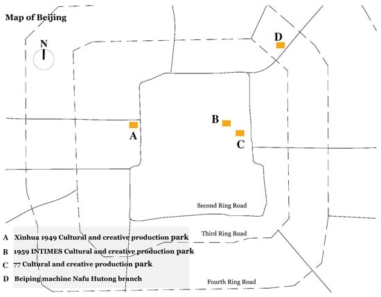 We choose four industrial heritage renovation projects in the central city of Beijing, China as examples, namely Xinhua 1949 Cultural and Creative Industry Park, 1959 INTIMES Creative Industry Park, 77 Cultural and Creative Industrial Park and Beiping Machine Nafu Hutong Store (Figure 3). These four industrial heritage sites were all formerly various kinds of factories, and after being renovated and revived, they have now been reintegrated into the city.