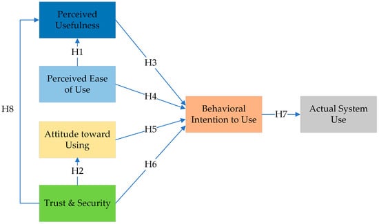 - Davis, F.D. Perceived usefulness, perceived ease of use, and user acceptance of information technology. MIS Q. 1989, 13, 319–339. [Google Scholar] [CrossRef]