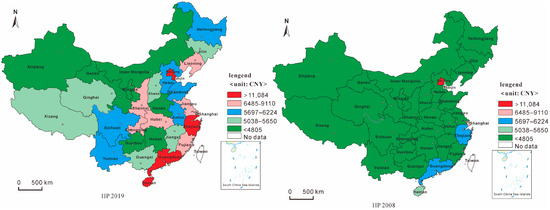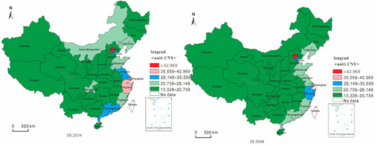 100(it) = 3.97. According to Equation (1), the actual values of DI at the threshold values can be calculated to be 24,471 and 28,195, respectively. Based on the DI values in 2019, 31 administrative units were divided into three categories, A, B and C, as shown in
