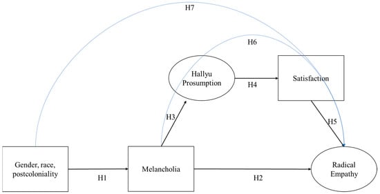 The correlation between gender, race, and postcoloniality among K-pop fans and the degree of their radical empathy is mediated by melancholia, Hallyu prosumption, and satisfaction.
