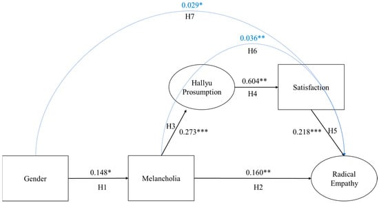 Finally, our structural equational modeling and bootstrap analysis corroborate both direct and indirect effects of all the contested variables in the model (Table 7). While gendered melancholia (H1) turned out to have direct effects on radical empathy (H2), the correlation between gender and radical empathy was mediated by melancholia, Hallyu prosumption, and satisfaction (H7). The mediating effect of Hallyu prosumption and satisfaction was also supported between melancholia and radical (H6). Finally, melancholia, Hallyu prosumption, satisfaction, and radical empathy all had direct effects on each other (H3, H4, H5).