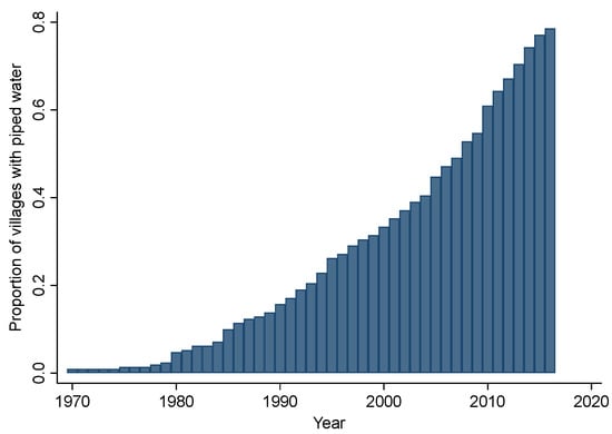 Several studies examining the outcomes of access to piped water in rural China use village fixed effects specification for causal identification [5,43]. In order to address the endogeneity arising from the non-random assignment of the year when the village was first connected to piped water, this paper uses village FE specification.