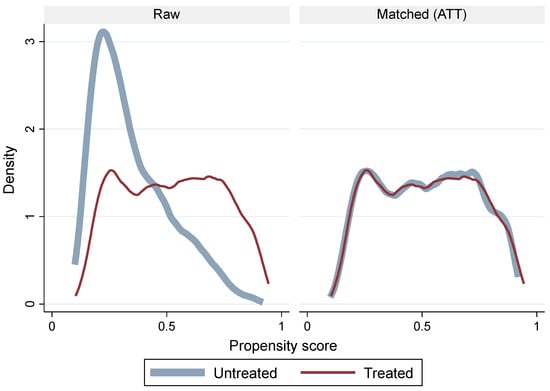 The treatment and control groups are matched according to the value using nearest-neighbor matching and kernel matching. Table 3 reports the balancing test results. Figure 2 displays the kernel density functions of the values of the treated group and the control group based on the after-matching and post-matching of the two groups, respectively. According to Table 3 and Figure 2, the PSM method significantly reduces the difference between the treatment group and the control group.