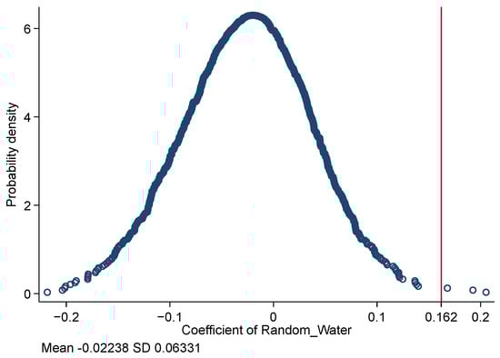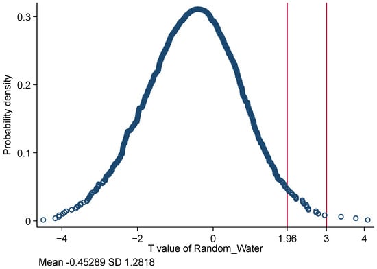 Some studies examining the consequences of infrastructure use random assignment of treated cities to perform placebo tests [44,45]. Following these studies, a placebo test was conducted by randomly assigning the year when the village was first connected to piped water to test whether unobservable factors drive these results. If the off-farm work participation is due to the access to piped water in the village fixed effects specification, then the coefficient should be insignificant for false assigning. We conducted 1000 times random assignments, and Figure 3 and Figure 4 report the regression results. The distributions of estimates using random assigning are mostly gathered around zero and are mostly insignificant, which indicates that the outcomes of the placebo test confirm the robustness and accuracy of the original village fixed effects specification.