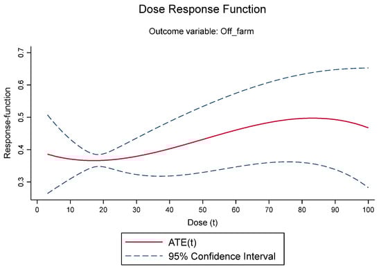 Farmers may exhibit heterogeneous behavior in making off-farm work participation decisions. The Dose Response Model (DRM) is an econometric model for estimating continuous treatments under heterogeneous responses to observable confounders [55]. The Dose Response Function (DRF) is equal to the average treatment effect (ATE) given the level of treatment t (that is, ATE(t)).