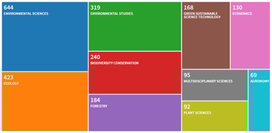 In the related literature on biodiversity and economic growth, the structure of the literature type is clearer and more objective than the structure of the research direction. It can be seen from Figure 2 that “environmental science” is the most concerned field, accounting for 34.00%, followed by “Ecology” which accounted for 22.33%, “environmental research” accounted for 16.84%, and “biodiversity conservation” accounted for 12.67%. The above fields determine the overall trend of research on biodiversity and economic growth.