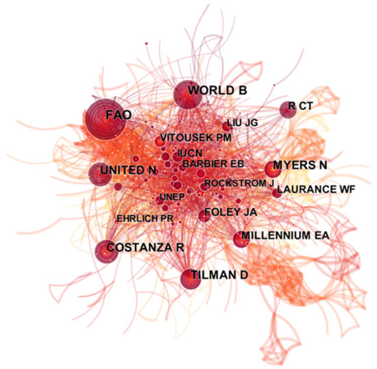 Through the processing of data from CiteSpace, authors’ collaborative networks can be identified, thereby making the relationship between different authors more accurate. Figure 3 shows the most cited authors in the area of biodiversity and economic development, with the number of citations proportional to tree ring size. Table 1 shows the top 10 highly productive authors in the field of biodiversity. The most frequently co-cited author was Fao (182), followed by World B (121), and Costanza R (121). The difference in co-cited frequency between authors ranked 4–6 was smaller, and the same occurred in the 7th–10th place. As shown in Figure 3, the 10 most prolific authors correspond to larger nodes and have more connections to other nodes, which indicates that they collaborate more frequently with other authors.