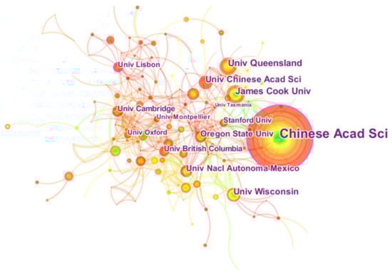 Table 2 lists the top ten high-yield institutions for biodiversity and economic growth research. As seen in Table 2, the Chinese Academy of Sciences published the most papers with 71, followed by James Cook University with 20, and the third-ranked institution was the University of Queensland with 19 publications. Numerous developed countries are important contributors to biodiversity research. It is worth mentioning that the Chinese Academy of Sciences has the highest centrality, which shows that it plays an important role in the institutional cooperation network. Because centrality is an indicator of the importance of nodes in the network.