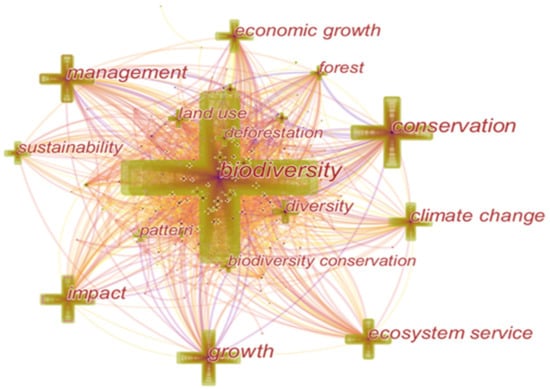 Figure 6 and Table 4 show the relatively intensive research words and phrases in the existing research: the first is biodiversity, a total of 663 times; the second is conservation, a total of 310 times; the third is growth, a total of 247 times; the fourth is management, a total of 223 times; the fifth is impact, with a total of 198 times; the sixth is ecosystem services, a total of 168 times; the seventh is climate change, a total of 167 times; the eighth is economic growth, a total of 144 times; the ninth is diversity, a total of 132 times; and the tenth is sustainability, a total of 111 times.