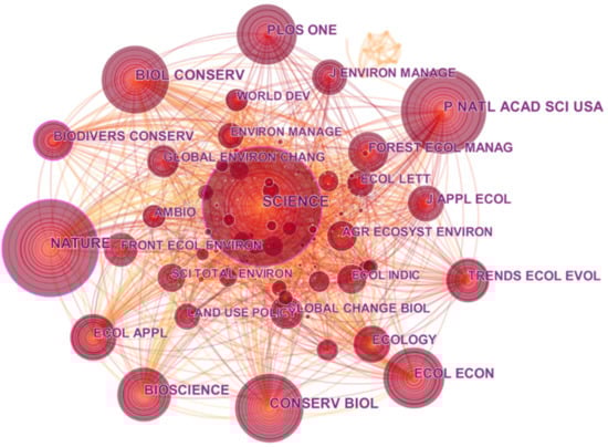 In Table 5, among all the journals that publish biodiversity, the most cited journals are Science, with a total of 915 citations, followed by Nature, with a total of 756 citations, Proceedings of the National Academy of Sciences of the United States of America, with a total of 649 citations, and Conservation Biology, with a total of 570 citations. The collaborative network among journals is shown in Figure 7.