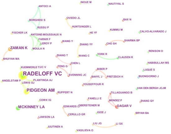 As shown in Figure 8 and Table 6, there is an increasing number of scholars focusing on biodiversity topics, each one analyzing the research from a different perspective. The top ten authors are listed in Table 6, and the data show that scholars represented by Radeloff V.C. occupy an important position in the collaborative network of authors, while they also maintain communication with other authors.