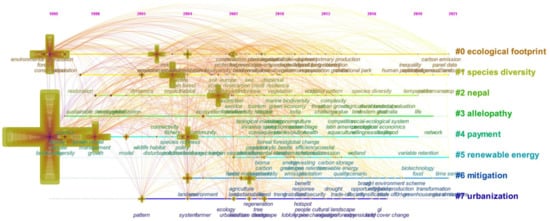 Figure 10 shows the timeline of keywords covered by the 26 years of research. In 1995, the main research topics focused on environmental degradation and the relationship between the ecological environment and human beings. Subsequent research is also based on these keywords as an extension. It can also be seen that the research in the past few years was focused on the practical problems caused by environmental degradation, and the focus in these years has gradually been placed on the economy and the construction of a new way of life.