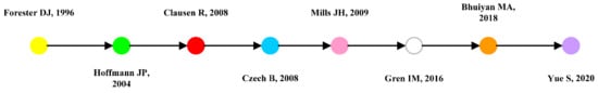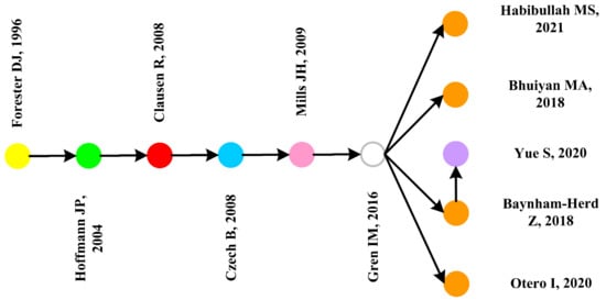 Through the analysis of these four paths, we found that scholars’ influence is very important in the development of the field, for example, Forester and Hoffmann, who are instrumental not only in the number of publications but also in the path nodes. Forester’s study, “Modeling human factors that affect the loss of biodiversity”, published in 1996 [5], focuses on the relationship between biodiversity change based on human-influenced factors. Hoffman’s 2004 study, “Social and environmental influences on endangered species: A cross-national study” analyzed biodiversity change in terms of social factors [58]. The difference between the two studies is that they are grounded in painless influences.