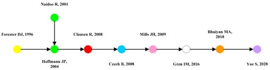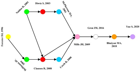The global key main path is proposed to improve some diffusion paths that have relatively low weights and may be ignored. Therefore, this paper uses the global key main path method to present more detail in a specific area. As can be seen from Figure 14, the previous studies are mainly divided into two trends and, under these two trends, there are also many overlaps and influences.