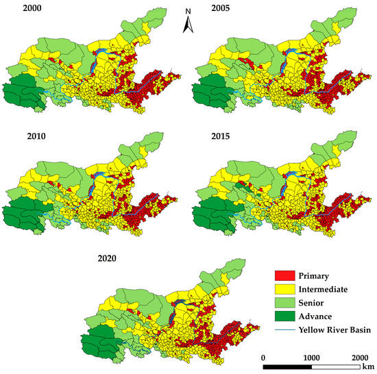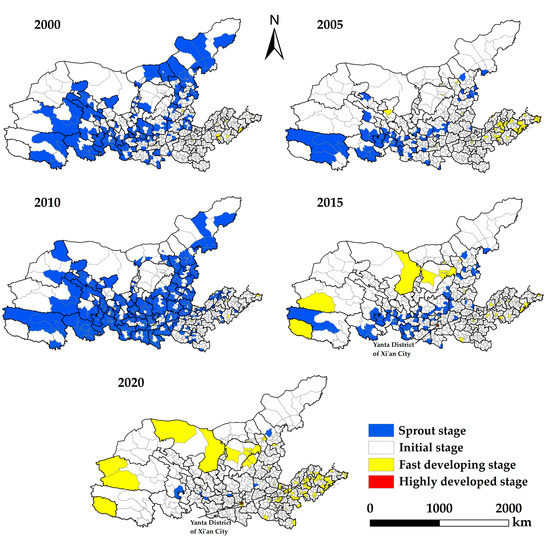 The comprehensive urbanization level of the Yellow River Basin in 2000 (0.139), 2005 (0.165), 2010 (0.115), 2015 (0.161), and 2020 (0.187) showed an upward trend from 2000 to 2005 and a downward trend from 2005 to 2010 (Table 4). The level of urbanization increased by 34.53%. There were 242 counties in the whole basin from the low stage to the high stage, accounting for 32.9% of the counties in the whole basin. From 2015 to 2020, there was one highly developed urbanization county (Yanta District of Xi’an), 157 counties from the embryonic stage to the initial development stage, and 84 counties from the initial stage to the rapid development stage. Except for 2010, the development level of county comprehensive urbanization was concentrated in the initial stage, accounting for 84.6% of the total number for the basin (2020). By 2020, there were seven counties in the embryonic stage, which was 21.1% lower than in 2000, and the initial stage and rapid development stage accounted for the main positions (98.8%).