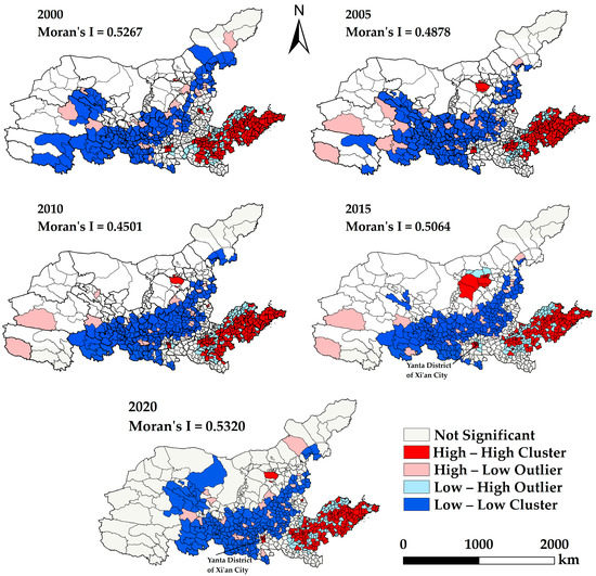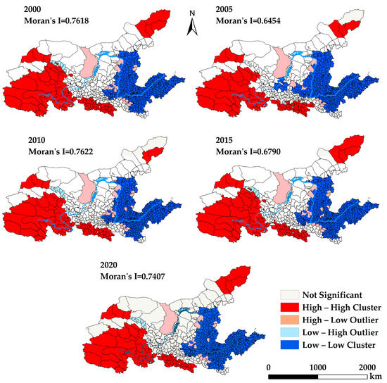 From 2000 to 2020, the spatial agglomeration of the urbanization level in the Yellow River Basin is mainly manifested in the fact that the H–H agglomeration area is mainly distributed in the Shandong Peninsula and the eastern and central regions of Henan, showing a zonal extension trend; the L–H agglomeration area is distributed in the periphery of the high–high correlation area and is surrounded by the periphery of the high–high agglomeration area. The low–low agglomeration areas are widely distributed, mainly with a northeast–southwest distribution in 2000 to the central Yellow River Basin in 2020; the H–L negative correlation area is mainly distributed at the edge of the low–low agglomeration area, which is small.