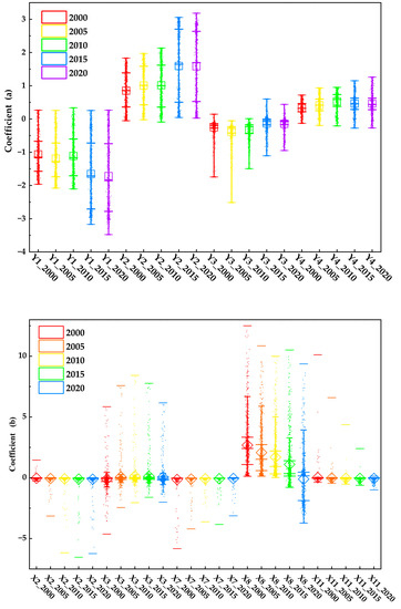 The regression coefficient changes of the impact factors in 2000, 2005, 2010, 2015, and 2020 were analyzed (Figure 6). The interaction strength of the two systems was evaluated by quartile Q1, lower quartile Q2, quartile difference (Q = Q1−Q2), mean, and range on the box plot. At the same time, the spatial characteristics of the impact of urbanization and ecosystem services were analyzed.