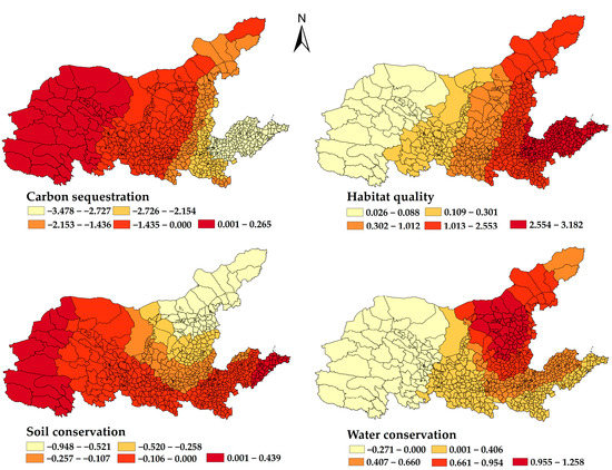 Carbon sequestration services (Y1). The impact on the comprehensive urbanization level was a north–south and east–west spatial differentiation (Figure 7). The influence coefficient of the upper reaches of the Yellow River, namely Qinghai Province, western Ningxia, and western Inner Mongolia, was positive and was promoted. The negative effect of the middle and lower reaches of the Yellow River gradually increased, and the intensity of the inhibitory effect reached −3.478 in the Shandong Peninsula and northeastern Henan. The boundary line of the positive and negative effects was at the junction of the upper and middle reaches of the Yellow River, which indicates that the lower the carbon sequestration stock in the middle and lower reaches of the Yellow River is, the higher the comprehensive urbanization development level is, while the upper reaches of the Yellow River were the opposite, showing that carbon sequestration inhibits urbanization development.