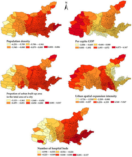 Number of beds in hospitals and clinics (X11). From the perspective of the spatial distribution of the influence coefficient, most of the Yellow River Basin showed a trend of increasing inhibition from east to west, while most of Shandong and Henan showed a promoting effect. The boundary between the positive and negative effects coincided with the boundary between the middle and lower reaches of the Yellow River (Figure 8).