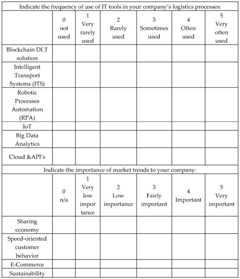 The data were collected from 38 experts who have at least 5 years of experience in the adoption of high-intelligence digital technologies for improving logistics processes in a company. We used the form (as presented in Figure 4) to obtain knowledge from experts, first on the frequency of adoption of high-intelligent digital technologies and then on the importance of market trends for them. The Likert scale was used. In order to obtain a comprehensive survey for our generic model, experts represented different types of enterprises, namely: manufacturing, retailing (e-tailing), logistics services, and combinations thereof.
