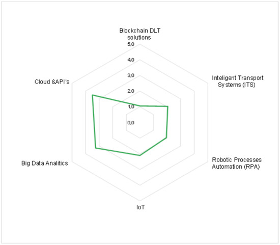 The results were analyzed following the research methodology presented in Figure 2. First, the data on the frequency of the application of digital technologies were calculated and presented in Figure 5. The most frequently adopted high-intelligence technology for improving the logistics processes was Cloud & API’s—an average of 3.5 on a 5-point rating scale, followed by Big Data Analytics. The Blockchain DLT solutions were used the most rarely or not at all—a mean of 1.1. The results were consistent with the conclusions from the literature review (see Section 2).