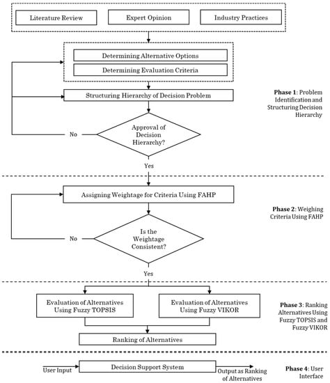 As discussed, AHP and TOPSIS are currently the most widely used MCDM techniques in construction. With the exception of a few cases, these methods were combined with fuzzy theory to eliminate crisp values and introduce vagueness to handle uncertainties, imprecision, or a lack of information. Fuzzy AHP (FAHP) is one of the most powerful and extensively used tools to assign weightage to criteria in MCDM. Therefore, it was used in this research to assign weightage to the sixteen chosen criteria. Though the triangular membership function is most widely used in FAHP for its simplicity, the trapezoidal function is considered to handle uncertainties, imprecision, or a lack of information in a better way. Therefore, the trapezoidal membership function was used in this research. Fuzzy TOPSIS was chosen to rank the alternatives as it is a widely used, familiar, and easy tool for decision-making that has acceptance in both industry and academia. However, a relatively new and less familiar tool, fuzzy VIKOR, was used in parallel to rank the alternatives. Fuzzy VIKOR was used to compare the results with a different technique and validate its reliability. It is expected that a comparison of results through fuzzy TOPSIS and fuzzy VIKOR was likely to enhance the acceptance of fuzzy VIKOR in construction. This study generated a TOPSIS extension that integrated subjective and objective weights. In addition to the subjective weights determined by decision makers, this study derived subjective weights from objective values using Shannon’s entropy as a basis [,].