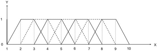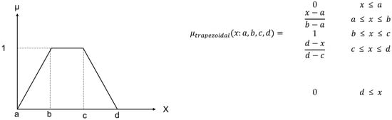 In the FAHP scale, the trapezoidal fuzzy number (TrFN) has four boundary values a, b, c, and d: The degree of membership increases between a and b, flattens between b and with a degree of 1 (i.e., values between c and d fully belong to the category), and then decreases between c and d (Figure 3). Each fuzzy set representing the categories described in Table 5 was represented by trapezoidal membership functions (Table 3 and Figure 4).