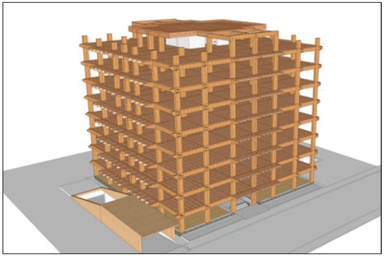 Structural elements of a building generally consist of beams, columns, tension members, and their connections []. The selection of the structural material in the case of building construction plays a vital role as it acts as the backbone of the structure and demands vast resources. In general, concrete, timber, steel, masonry, composite (timber–steel, timber–concrete, steel–concrete), etc., are used to construct multistory buildings. Reinforced concrete (RC) is the most commonly used structural material for building construction. However, ironically, concrete is one of the leading sources of environmental degradation and is harmful to the ecosystem and environment []. Structural steel (SS) may be used to replace concrete due to its numerous advantages, including strength and flexibility. Nevertheless, it requires a significant amount of energy during manufacturing and may be expensive in some situations []. Masonry is a time-tested alternative to concrete construction. However, burned bricks may emit significant levels of carbon during the manufacturing process, and masonry construction requires a substantial amount of cement []. As a building material, timber has a better energy-saving and carbon-reduction performance than other traditional materials. However, a lack of design standards and fire-resistance issues are commonly highlighted as impediments, inhibiting timber use as a structural material for multistory buildings, unlike masonry, concrete, or steel []. This phenomenon has led to a rethink regarding alternative building construction materials to achieve sustainability.