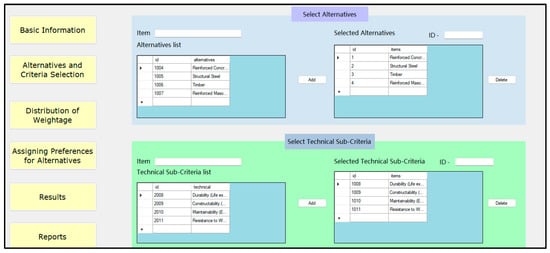 This study considered four alternative options of structural materials (RC, SS, RM, and timber) and sixteen evaluation criteria, taking four from each pillar of sustainable construction, as mentioned in Table 1. The weightage of criteria was calculated using fuzzy AHP with a trapezoidal membership function. Fuzzy TOPSIS and fuzzy VIKOR were used to rank the alternatives using the weightage obtained through fuzzy AHP. Fuzzy TOPSIS was used to develop the DSS software out of two ranking methods. The details of the research framework are shown in Figure 1 and the hierarchy of the decision problem is shown in Figure 2.