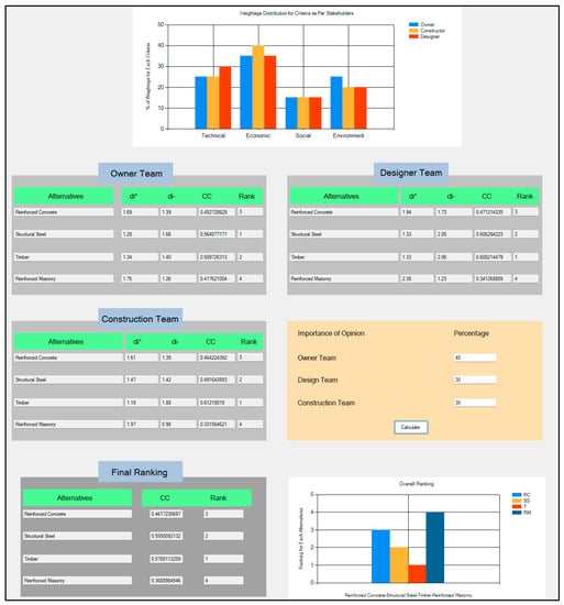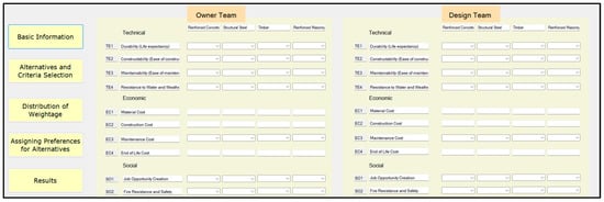 The remarkable contributions of this research comprise the integration of technical aspects with the commonly used three pillars (economic, social, and environmental) for sustainability assessment, including a case study; the application of two different MCDM methods (Fuzzy TOPSIS and Fuzzy VIKOR) to rank alternatives with Shannon’s entropy to handle qualitative and quantitative data, and trapezoidal membership functions to obtain more realistic results; and the development of a DSS application that shall assist decision makers in choosing evaluation criteria and assigning relative importance to those criteria in the combination of qualitative and quantitative methods in an IPD framework, not only to select the most sustainable structural material but also to solve a wide range of construction-related problems.