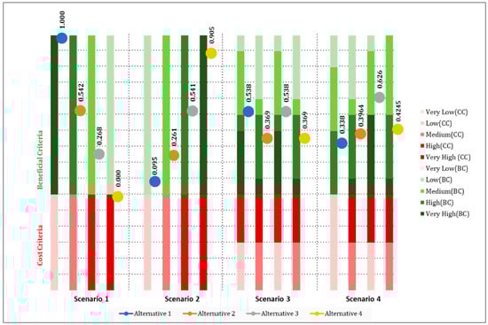 Multi-criteria decision-making (MCDM) is fundamentally a systematic approach to solving problems of varying degrees of structure []. This strategy has emerged as a vital tool for addressing real-time solutions for problems of uncertainty, particularly for sustainable construction engineering and environmental sustainability []. It provides decision makers with an informed recommendation from a finite list of alternatives (also known as actions, objects, solutions, or candidates), while being evaluated from multiple viewpoints, called criteria (also known as attributes, features, or objectives) []. The MCDM technique generates alternative scenarios, establishes criteria, assesses alternatives, weighs the criteria, and ranks the alternatives []. Subjective (qualitative) methods and objective (quantitative) methods are the two types of weighing techniques. The subjective methods determine weights according to the preference or judgments of decision makers. On the other hand, objective techniques, such as the entropy method, multiple objective programming, etc., determine weights by solving mathematical models without considering the decision maker’s preferences []. MCDM methods range from a single approach (such as the analytic hierarchy process and fuzzy sets) to a combination of the methods, also known as the hybrid approach [].
