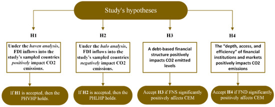 Howbeit, FDI inflows might harm or protect the host country’s environment by contributing to a rise or fall in CO2 emissions. Therefore, the analyses carried out in this study are in two folds: one for the haven analysis to test and validate the existence of the PHVHP and the other for the halo analysis to test and validate the existence of the PHLHP. Furthermore, this study analyzes the effect finance (represented by a debt-based financial structure and financial development) has on CO2 emissions. Therefore, this study puts forth the hypotheses shown in Figure 3.
