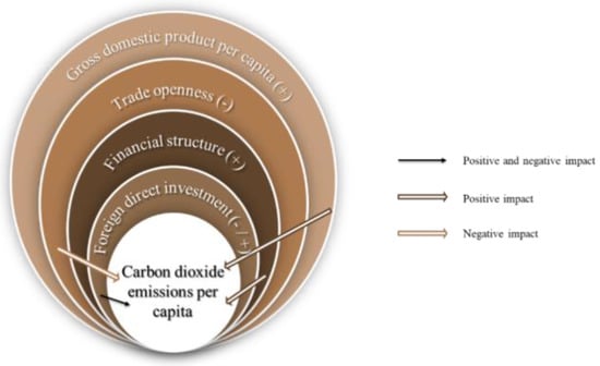 Funding via an optimal capital structure (thus, finance activities utilizing either more debt or equity) has always been an issue for countries’ governments and management in companies. In retrospect, for countries, [50] found that there would be an 11.5% reduction in global per capita carbon emissions if all nations’ financial structures were converted to at least 50% equity financing, implying that a good financial structure in the form of equity financing will propel a country’s financial and environmental development. Empirically testing the causal nexus between CO2 emissions, financial development, and other indicators, Jamel and Maktouf employed the Cobb–Douglas production function and discovered that the neutrality hypothesis connects carbon emissions and financial sector development inflows in their study [51]. One way or another, [52,53] employed financial development or financial structure as their explanatory variables to explore the correlation effect they have on CO2 emissions. Therefore, this study adopts them as explanatory variables to analyze how other financial variables aside from FDI might play a role in the rise or fall of CO2 emissions.