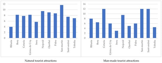 For the former related to natural attractions’ supply, it came out that the most endowed is the commune of Sânmartin with 46.7% or 11.67 points in absolute values, and the least endowed is Biharia commune (Table 1, Figure 2). The gap is given by the presence of natural factors (mainly, its thermal waters and therapeutic muds) and the presence of natural areas found in Sânmartin commune, placing it in the top of the category, whereas, at the opposite end, is Biharia, which is deprived of such resources and is bottom-placed. Thus the commune of Sânmartin has an average potential in terms of natural attractions, whereas Biharia has a very low potential. We are not going to insist upon these attraction features and the way in which the attractions scores were allocated, as they are extensively dealt with within the study of Tătar et al. (2018) [] and briefly summarized at the section Previous tourism research results of the constituent communes of the Oradea Metropolitan Area of the current study. The average of the rural metropolitan area is of 7.95 points which situates it at a low (towards average) score compared to the 25 value points granted to this category.