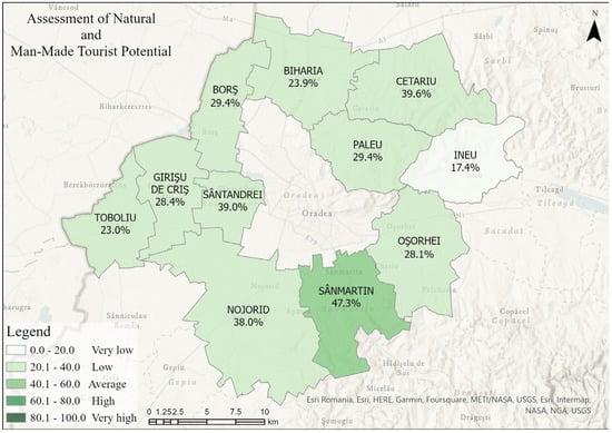In terms of the tourist concentration poles of both natural and man-made rural OMA attractions, they are preponderant in the west in Sântandrei, south in Nojorid, and in south-east in Sânmartin communes, as well as to the north-east in Cetariu commune. Sanmartin emerges as the hotspot in terms of visitor attractions concentration with the highest value. The best tourist potential is held by Sânmartin commune for all the analyzed categories, such as natural and man-made attractions and technical and tourist facilities supply, which features an average potential, followed by Nojorid, Borș, Biharia, Oșorhei, Sântandrei, Cetariu, and Paleu with a low tourist potential, and Girișu de Criș, Ineu and Toboliu communes with a very low tourist potential (Figure 6). This almost tourist-exclusive consumption in a proportion of over 93% [], which is currently occurring in Sânmartin commune, shows that flows need to be dispersed more evenly among other metropolitan communes, and the current consumption is unsustainable. The other single commune where thermal waters are capitalized is Nojorid, which hosts an operational swimming pool park which also uses thermal water for bathing and cure purposes, but the demand gap between Sânmartin and Nojorid is still very wide; the latter registered barely 5153 arrivals during 2001–2020, whereas the former registered 2,791,492 arrivals during the same time interval []. If the accommodation facilities and bathing pools infrastructure were increased and upgraded in Nojorid commune, it could divert tourist over redundant flows of Sânmartin and reduce anthropic pressure on the southern metropolitan part, and thus yield a more sustainable consumption. The touristic pressure on Sânmartin commune has yielded negative outcomes for its natural habitat, mainly referring to the natural reserve of Băile–1 Mai spa from where three thermal endemic species have become extinct [,].