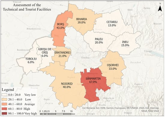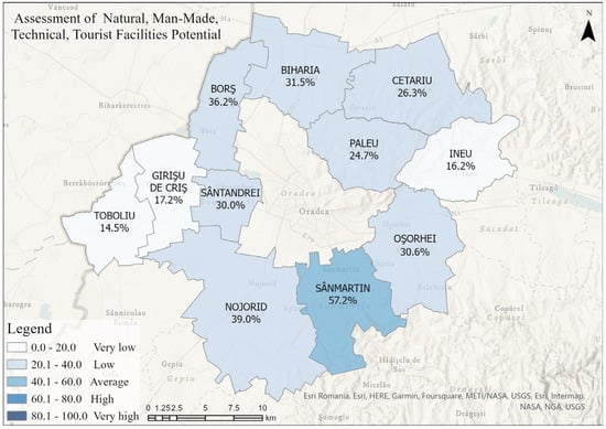 By accomplishing the total rural OMA assessment of the natural, man-made tourist attractions, and technical and tourist facilities, we supply a commune ranking result where we find three communes with a very low score, below 20%, such as Toboliu, Ineu, and Girișu de Criș commune; seven communes with a low tourist potential between 20 and 40%, such as Paleu, Cetariu, Sântandrei, Oșorhei, Biharia, Borș, and Nojorid; and the single commune of Sânmartin with an average tourist potential of over 50% (Figure 6).