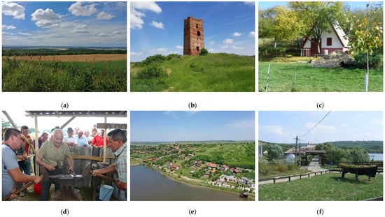 (a) Very gentle and very wide slopes between Șișterea and Șușturogi: cereal fields, meadows and forests waiting to be discovered by nature lovers; (b) The Cheresig Donjon: between space, antiquity and history lovers; (c) Holiday home in Tăutelec; (d) The village traditions and crafts attract tourists of all ages and professions. Picture from Cetariu Days; (e) In the foreground, in the new part of Paleu Village, we notice a dispute between the new habitat (holiday homes, restaurants and guesthouses) and the two environments (the lake and the hill occupied by pastures and shrub formations), with the result that discovery and weekend tourism and leisure set the tone for the sufficiently pronounced artificialization of this part of the village; (f) The location in the immediate vicinity of Oradea makes the village of Săldăbagiu de Munte recognize the fierce dispute and competition for land of the city, with one of the results being the installation of the tourist complex Hanul Pescarilor.