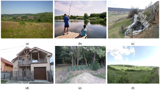 (a) Idyllic rural landscapes at Șușturogi invite you to hike and discover the traditional houses belonging to the isolated Romanian community; (b) The Santău Mic lakes are attractive not only for locals and citizens of Oradea but also for foreigners, given the location of the lakes near the Hungarian border; (c) A geotouristic resource such as the Betfia Aven creates, beside touristic interest, also conflict with fans of motorized touristic activities; (d) A property that once served tourists awaits its new owners who may even be tourists; (e) The Nature Reserve Narcissus Forest near Alparea is of interest mainly for scientific and ecotourism; (f) For hiking and discovering rural nature, the wide hilly landscapes with meadows, deciduous forest and farms (including organic) of Felcheriu are easy to visit.