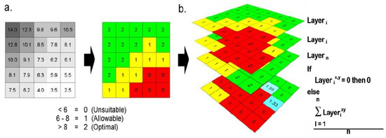 The Analysis Hierarchy Process (AHP) approach can be used to process a suitability mapping from each of the above suitability parameters. According to Figure 3 [20], this strategy involves estimating values using an analytical framework. As illustrated in Figure 3, the suitability parameter data were divided into three categories: highly suitable, suitable, and unsuitable. Following reclassification, the data were compiled and once more evaluated against the preexisting parameters as shown in Figure 3, resulting in the creation of the suitability map’s results [21].