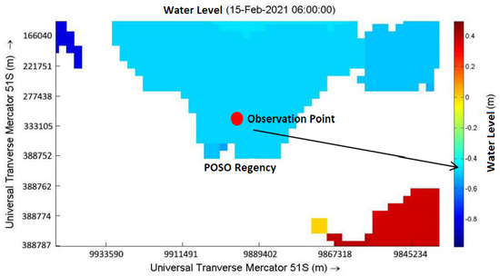The RMSE approach was used to test and verify the model between the simulation results and the results of the measuring station (Delft Dashboard). The water level elevation data from the model in Figure 4 and Figure 5 were used in the RMSE formula. The IHO monitoring station relates to the Poso station, which can be found in the Delft Dashboard program (see Table 2).