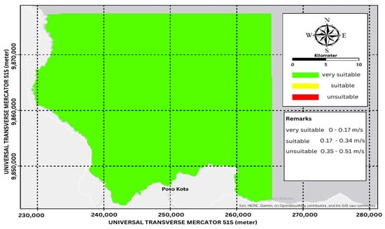 Based on the current speed category, all areas on the suitability marking are marked green as shown in Figure 7 as very suitable for marine tourism. It can also be observed that the current speed in this area can be considered low, at about 0.17 m/s, which makes it suitable for tourism.