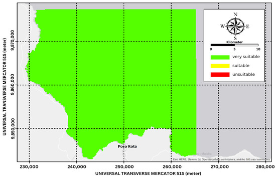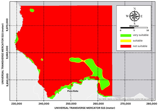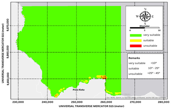 The AHP mapping result shows that Poso Regency’s coastal areas have suitable depth for marine tourism activity with less than 3 m of depth. Compared to the Pantar Strait area, which has a depth of 1.1–2.6 m [24], Poso Regency’s coastal areas are more suitable for swimming and bathing. Based on current speed, with a maximum current speed of 0.17 m/s, it is marked as very suitable [25]. In the water clarity category, the AHP mapping showed many varieties of marks along the areas. Even though it shows lower water clarity compared to other coastal areas, it was still marked as very suitable. The coastal area in Poso Regency is considered as flat beach, which has a slope of less than 10°. This will be an advantage in the safety and convenience factors for marine tourism.